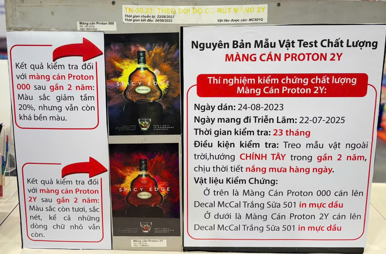 Bảng so sánh thực tế bản in sử dụng màng cán Proton 2Y kháng UV sau 2 năm cho thấy giữ bền màu vượt trội so với màng cán thông thường..